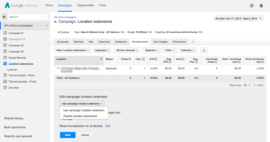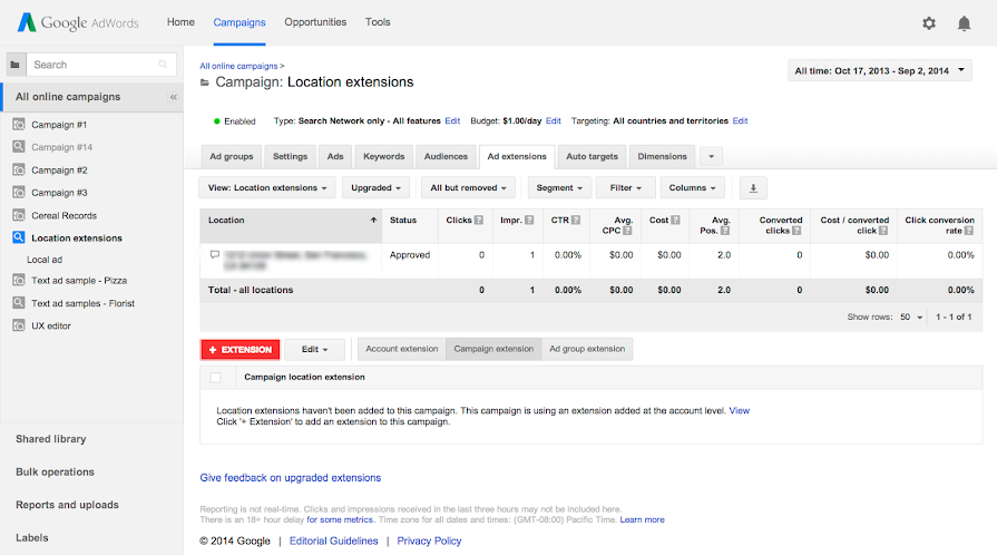 - You can apply new location extensions to multiple campaigns and ad groups when you click the +Extension button at the All Online Campaigns level.