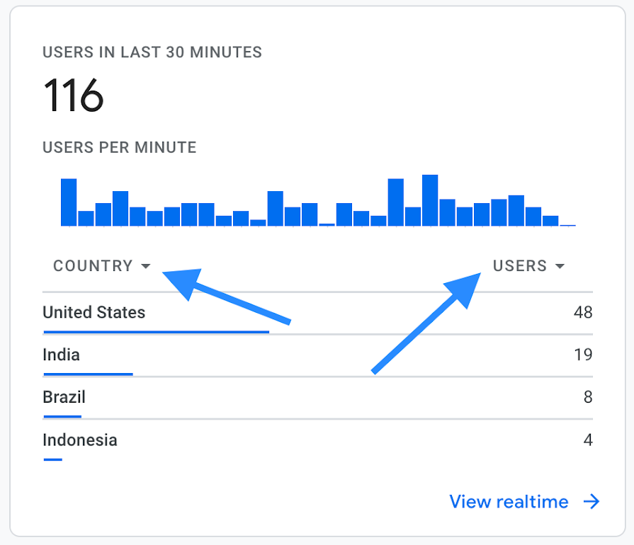 Quando você personaliza o card "Tempo real", as outras pessoas na sua propriedade não têm acesso às mudanças. Se você alterar a métrica, a dimensão ou a data no card, suas escolhas vão ser restauradas em sessões futuras.