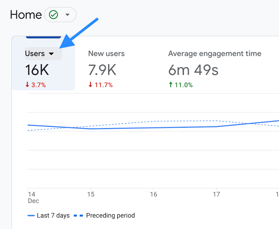 Você também pode passar o cursor sobre uma métrica para abrir um menu suspenso e fazer mudanças. Quando você personaliza o card de visão geral, as outras pessoas na sua propriedade não têm acesso às mudanças. Se você alterar a métrica ou a data no card, suas escolhas vão ser restauradas em sessões futuras.