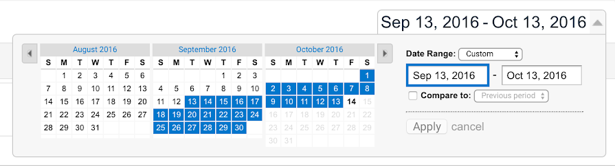 At the top of every report is a date-range. This lets you set the time period in which you want to analyze report data. Click the date range to open up the date range selector.