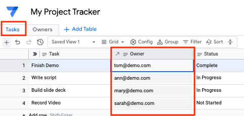 AppSheet データベースのどのテーブルでも、ラベル列を選択できます。ラベル列を使用すると、参照先テーブルに表示させたい列を指定できます。下図に示すように、[Owners] テーブルの [Name] 列を [Tasks] テーブルに表示する代わりに、[Email] 列をラベルとして設定し、[Email] 列を表示できます。