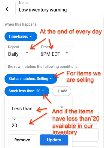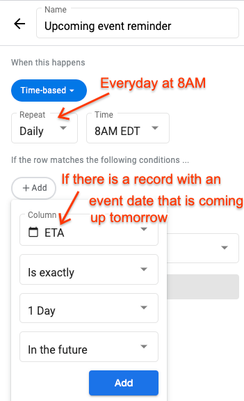 In particular, time-based bots are great when used with a condition on a Date-type column, so you can do things like:
