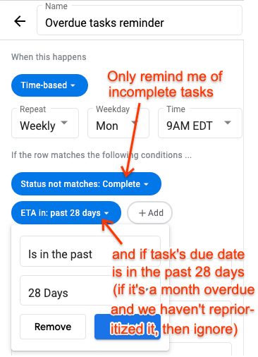 - NOTE: be careful not to accidentally configure your bot to miss days! For example: a bot set to trigger every week on Monday, and check for tasks with a “due date” that is exactly 1 day in the future -- this will only remind you of tasks due on Tuesday and miss any tasks that have due dates on the rest of the days.