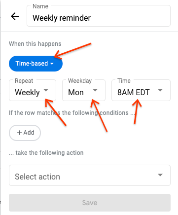 Time-based bots are great for recurring reminders or monitoring-type alerts, such as sending a reminder for overdue tasks, etc. We currently support the ability to trigger on a daily or weekly basis, and you can set an approximate time for when the bot will trigger (it should trigger within 30 minutes of the selected hour time range):