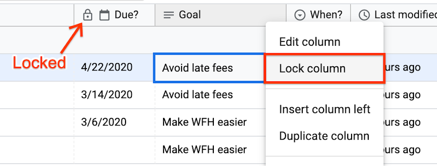 You can lock a column by opening up the context menu for a column (by right clicking the column header or via the overflow menu), and selecting the “Lock column” menu option.