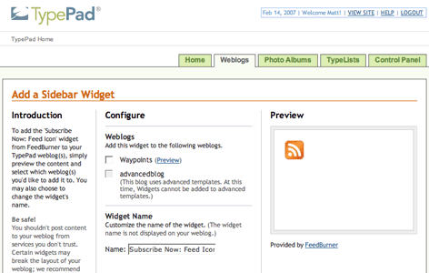 There are two ways to use FeedBurner's Publicity Tools. You can add the FeedBurner Subscribe Now "chicklet" or the FeedBurner Email Subscriptions functionality from your TypePad Widget Gallery in your TypePad account. Alternatively, instructions for adding a "subscribe chicklet" links are provided below: