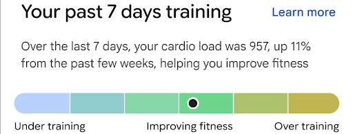 - État de l'entraînement : indique l'efficacité de vos derniers entraînements. Vous recevez une notification si vous vous sous-entraînez, si vous améliorez votre forme physique ou si vous vous surentraînez. Cela peut vous aider à décider si vous devez ajuster vos prochaines séances d'entraînement.