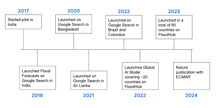 Google has been using artificial intelligence to forecast floods since we started this project in 2017. Over the past few years our model has developed significantly. When we first started, we relied on real time river data from each country we forecasted in. Thanks to advancements in AI, we can now forecast in most countries in the world.