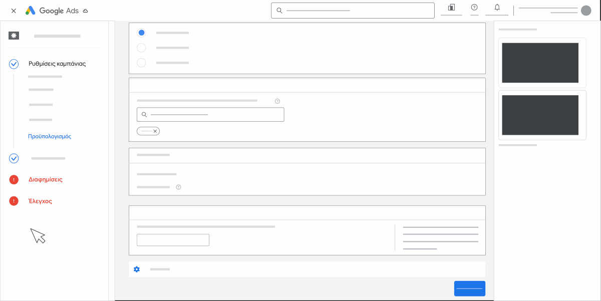 Έλεγχοι εύρυθμης λειτουργίας καμπάνιας: Κατά τη δημιουργία της καμπάνιας σας, ενδέχεται να λαμβάνετε χρήσιμες οδηγίες με βάση τις επιλογές σας. Αυτοί οι έλεγχοι εύρυθμης λειτουργίας ενδέχεται να υποδεικνύουν ζητήματα που μπορεί να οδηγήσουν σε μειωμένη απόδοση ή να είναι αρκετά σημαντικά ώστε να αποτρέψουν την προβολή διαφημίσεων. |