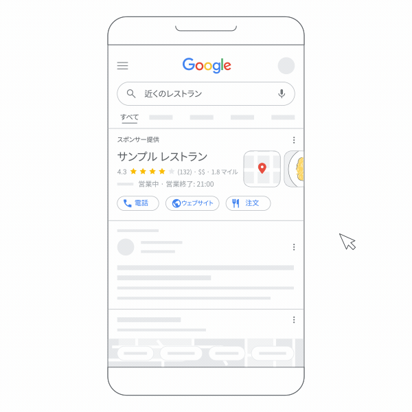 ユーザーが Google マップで店舗を検索したり、店舗のある地域を探索したりすると、Google はこれらの行動をお客様の店舗とマッチングします。お客様の店舗の近くにいたり、お客様の店舗がある地域に興味を示していたりするモバイル デバイス ユーザーに広告を表示できます。