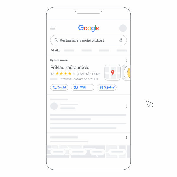 Keď zákazníci hľadajú firmy alebo skúmajú určitú miestnu oblasť v Mapách Google, Google priraďuje tieto akcie k adrese vašej firmy. Vaša reklama sa tak môže zobraziť v mobilnom zariadení komukoľvek, kto sa nachádza v blízkosti vašej adresy alebo o ňu prejaví záujem.