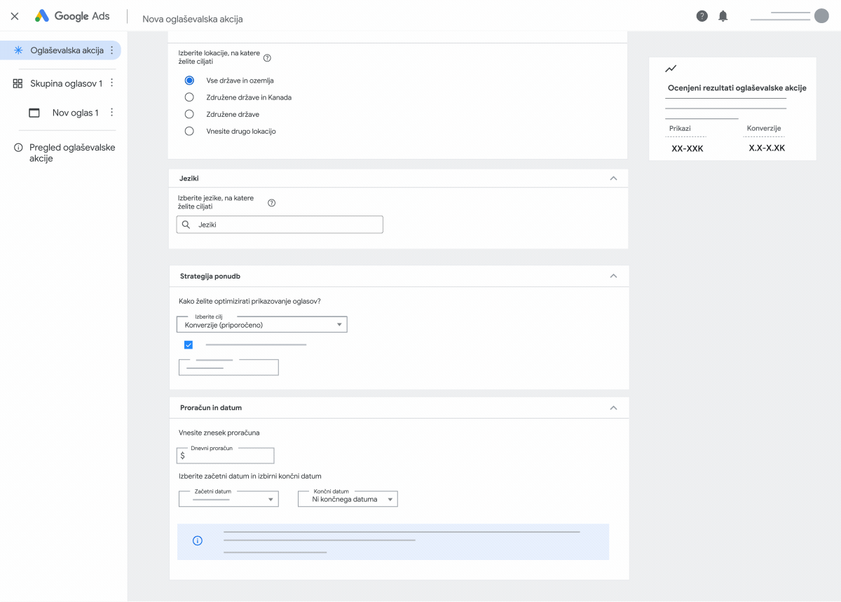 Ciljanje je privzeto nastavljeno na ravni skupine oglasov, da se zagotovi boljša optimizacija uspešnosti oglasov. Za jezik je privzeto izbrana možnost »Vsi jeziki«, za lokacijo pa »Vse lokacije«. Sprememba ciljanja na raven oglaševalske akcije priporočamo samo, če želite ciljati na polmer okoli lokacije.