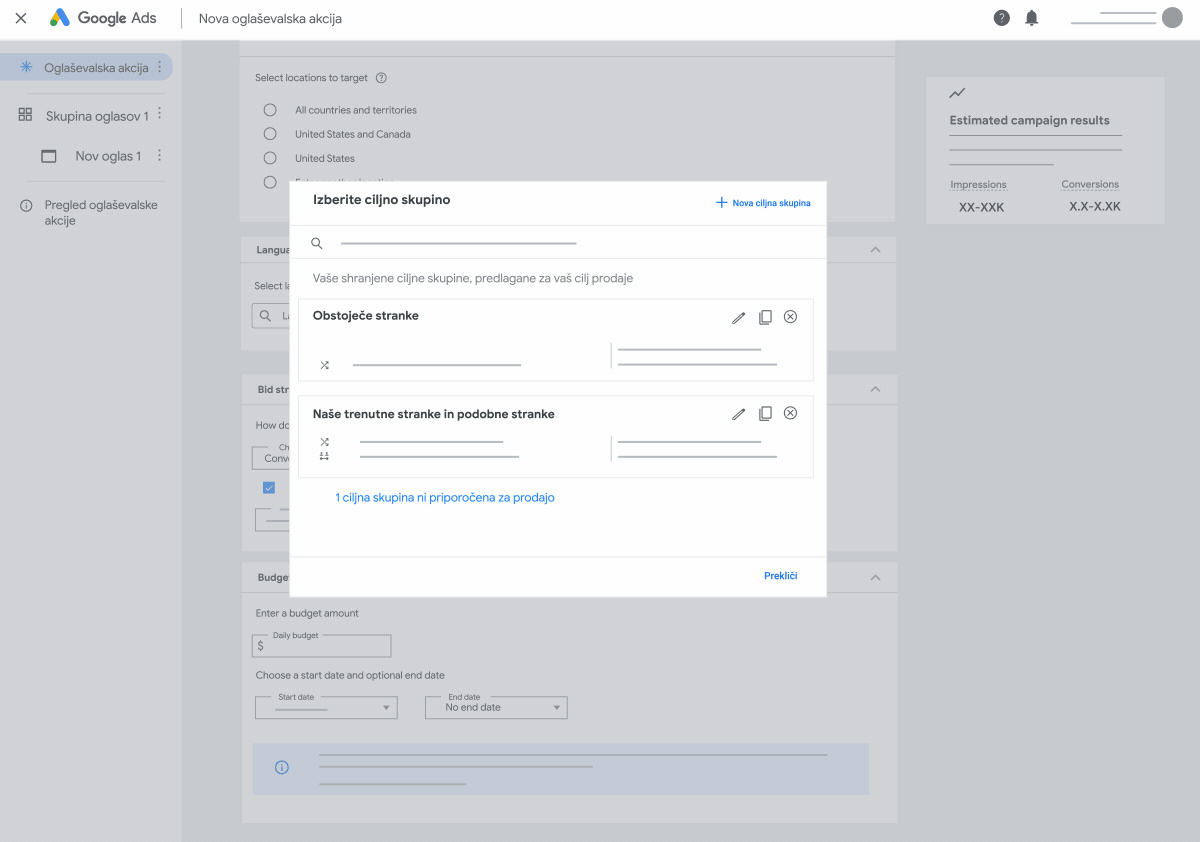 S ciljanjem na ciljne skupine lahko dosežete nove in ustrezne ciljne skupine, za katere je verjetno, da bodo izvedle konverzijo, uporabnike na določeni lokaciji, uporabnike, ki govorijo določen jezik, uporabnike z določenim zanimanjem in uporabnike, podobne kupcem vaših izdelkov ali storitev. Če lokacije in jezika še niste določili na ravni oglaševalske akcije, lahko to določite tudi na ravni skupine oglasov.