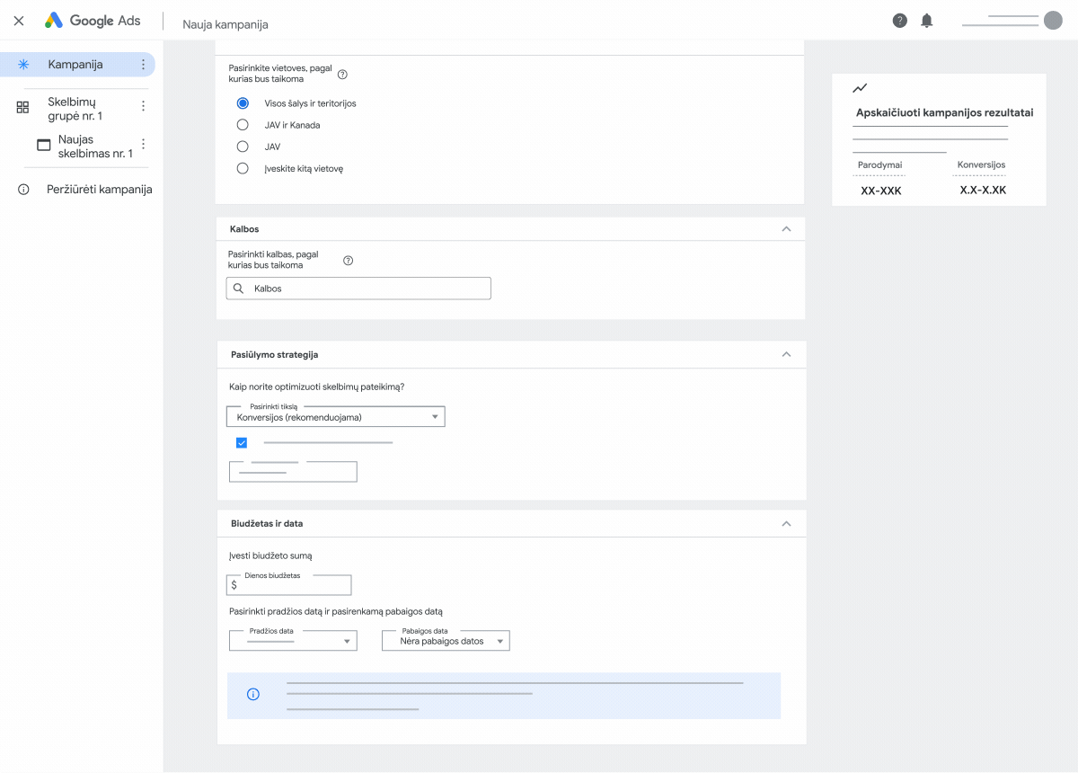 Jei norite užtikrinti, kad jūsų skelbimai pasiektų norimus klientus, galite įtraukti kalbas, kuriomis kalba jūsų klientai, ir vietoves, pagal kurias norite taikyti. Sužinokite daugiau apie taikymo pagal vietovę ir kalbą pridėjimą.
