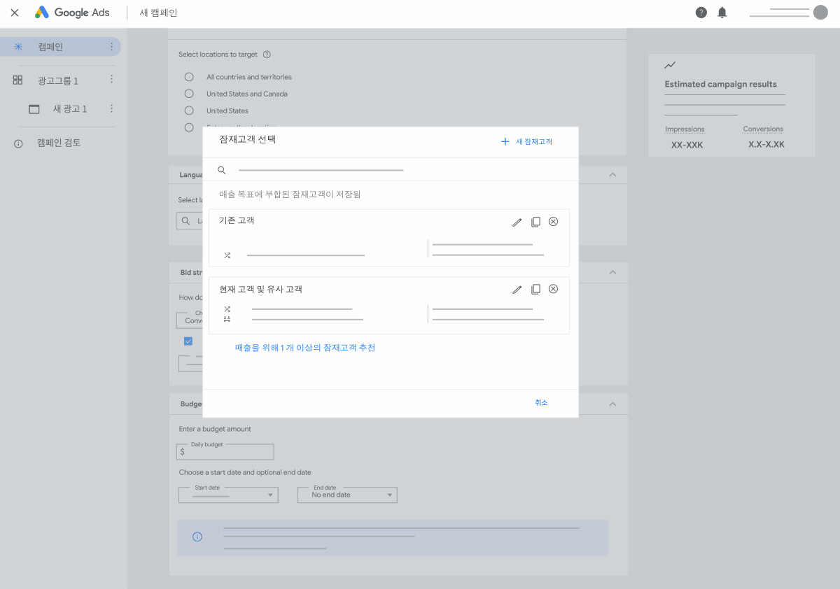 잠재고객 타겟팅을 사용하면 전환 가능성이 높은 관련성 있는 신규 잠재고객, 특정 지역의 사용자, 특정 언어를 사용하는 사용자, 특정 분야에 관심을 가지고 있는 사용자, 광고주의 제품 또는 서비스의 고객과 유사한 사용자에게 도달할 수 있습니다. 캠페인 수준에서 아직 위치와 언어를 지정하지 않은 경우 광고그룹 수준에서 정의할 수도 있습니다.