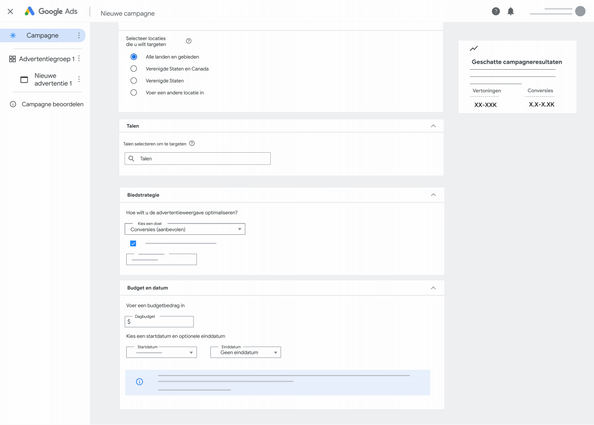 Targeting wordt standaard ingesteld op advertentiegroepniveau om de prestaties van uw advertenties beter te optimaliseren. De taal is standaard ingesteld op Alle talen en de locatie is ingesteld op Alle locaties. We bevelen targeting op campagneniveau alleen aan als u een radius rond een locatie wilt targeten.