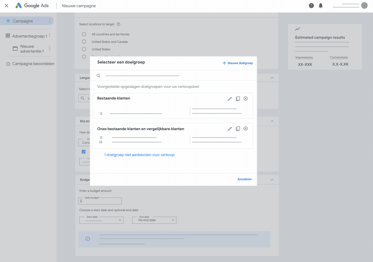 Met doelgroeptargeting kunt u nieuwe, relevante doelgroepen bereiken die waarschijnlijk converteren: mensen op een bepaalde locatie, die een specifieke taal spreken, die een bepaalde interesse hebben en die vergelijkbaar zijn met klanten van uw producten of services. U kunt de locatie en taal ook op advertentiegroepniveau definiëren, als u dat nog niet heeft gedaan op campagneniveau.