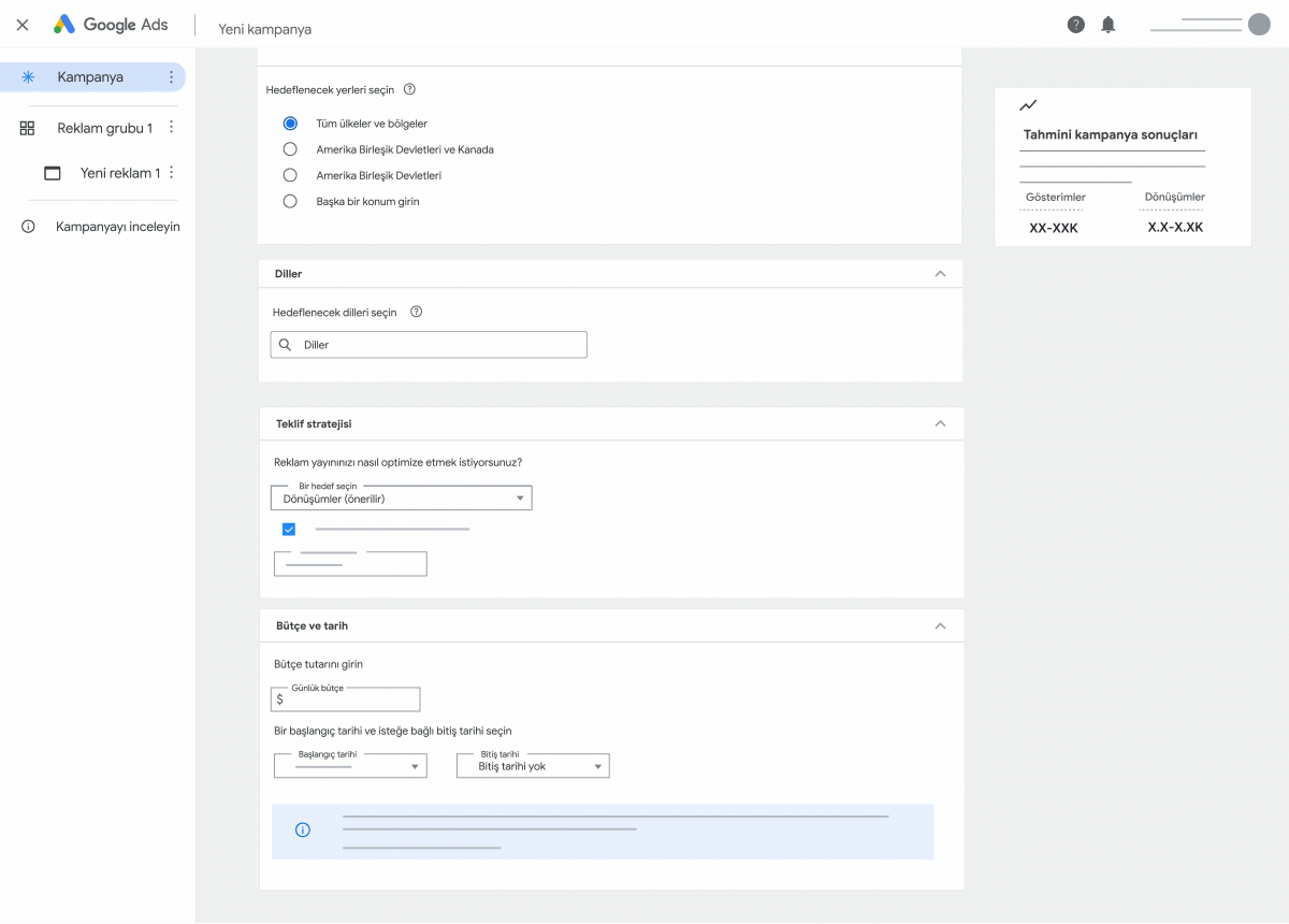 Reklamlarınızın istediğiniz müşterilere ulaşmasını sağlamak için, müşterilerinizin konuştuğu dilleri ve hedeflemek istediğiniz konumları ekleyebilirsiniz. Konum ve dil hedefleme hakkında daha fazla bilgi edinin.