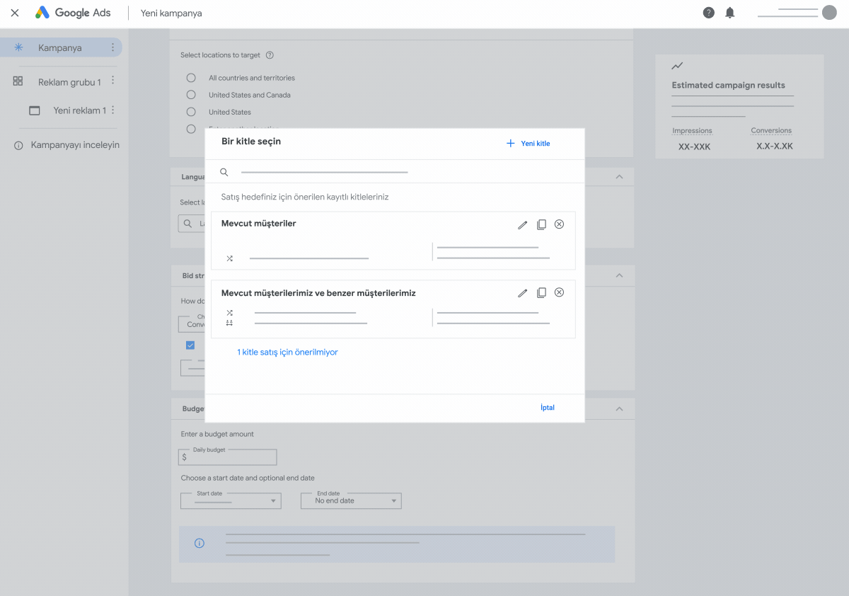 Kitle Hedefleme sayesinde, dönüşüm gerçekleştirme olasılığı yüksek olan yeni ve alakalı kitlelere; belirli konumdaki, belirli bir dili konuşan, belirli ilgi alanına sahip kişilere ve ürün veya hizmetlerinizin müşterilerine benzer kullanıcılara ulaşabilirsiniz. Kampanya düzeyinde belirlemediyseniz, konum ve dil hedefinizi reklam grubu düzeyinde de tanımlayabilirsiniz.