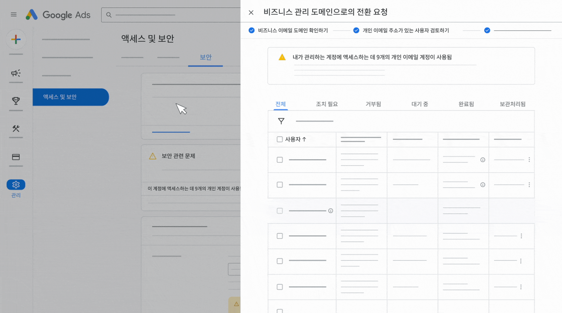 개인 정보를 보호하고 무단 액세스 위험을 줄이기 위해 Google Ads 계정 관리자는 회사의 광고 계정에 대한 개인 액세스 권한이 있는 사용자에게 비즈니스 이메일로 전환하도록 요청할 수 있습니다.