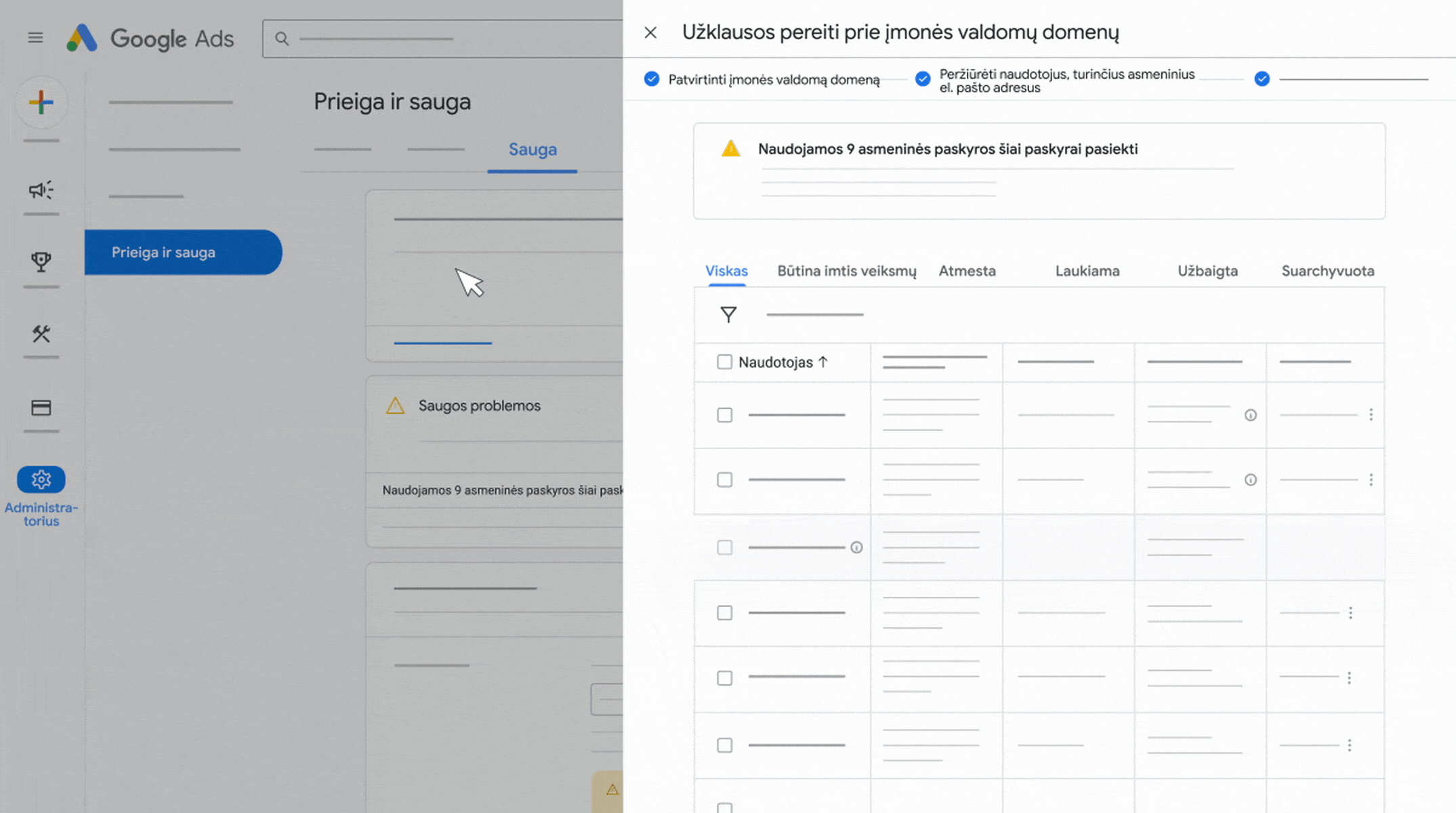 Siekdamas padėti apsaugoti privačią informaciją ir sumažinti neteisėtos prieigos riziką, „Google Ads“ paskyros administratorius gali paprašyti, kad asmeninę prieigą prie įmonės skelbimų paskyros turintys naudotojai pradėtų naudoti įmonės el. pašto adresą.