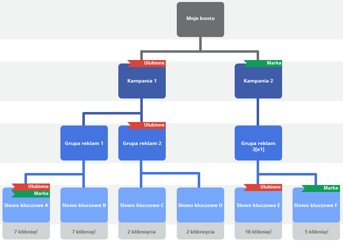 Na poniższym diagramie widać, jak można stosować etykiety do określania skuteczności niestandardowych kategorii na koncie. W tym przykładzie zastosowano do różnych elementów na koncie dwie etykiety: „Ulubione” i „Marka”. Warto wiedzieć, że etykiety nie są dziedziczone przez składniki kampanii. Oznacza to, że po zastosowaniu danej etykiety do kampanii odnosi się ona tylko do tej kampanii, a nie do znajdujących się w niej grup reklam i słów kluczowych. Jeśli chcesz nadać etykietę również grupie reklam lub pojedynczemu słowu kluczowemu, musisz zastosować ją osobno do każdego z tych elementów.