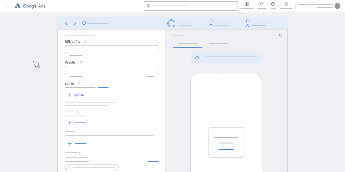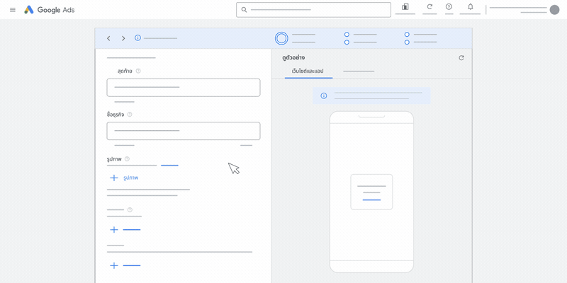 กรอกข้อมูลโฆษณาให้สมบูรณ์ คุณสร้างบรรทัดแรกและคำอธิบายได้หลายแบบเพื่อให้แสดงในโฆษณา Display ที่ปรับเปลี่ยนตามพื้นที่โฆษณา และสามารถอัปโหลดสิ่งต่างๆ ต่อไปนี้ได้หลายเวอร์ชัน
