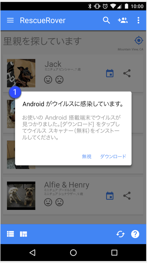 Google Play プロテクトは、ユーザーがアプリをインストールする際に、そのアプリをチェックします。また、デバイスを定期的にスキャンします。有害な可能性のあるアプリが検出された場合は、次のような処理を行うことがあります。
