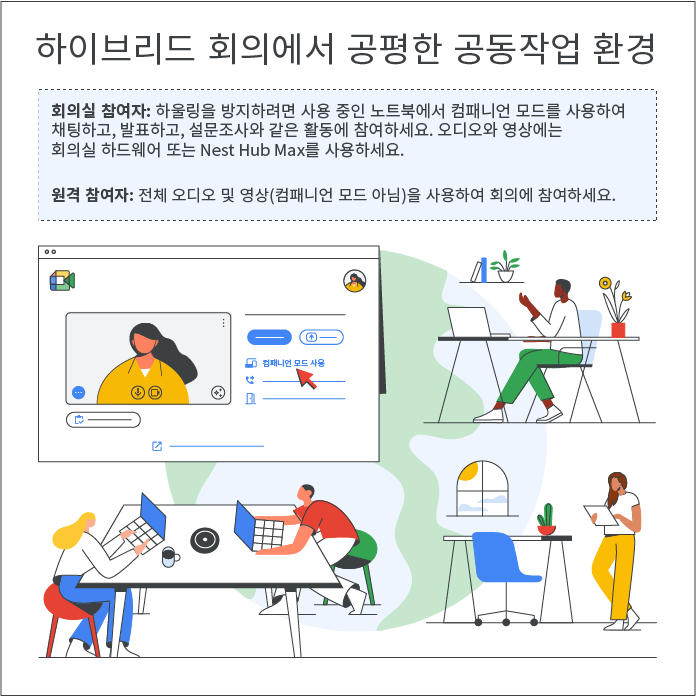 원격 참석자와 회의실 참석자가 섞여 있는 하이브리드 회의의 경우, 회의실에서 참여하는 참석자는 회의실 하드웨어 또는 Nest Hub Max를 사용해 개별적으로 채팅하거나, 질문에 찬성 투표하거나, 설문조사에 답할 수 없습니다. 대신 컴패니언 모드를 사용하면 참석자의 협업을 개선할 수 있습니다.