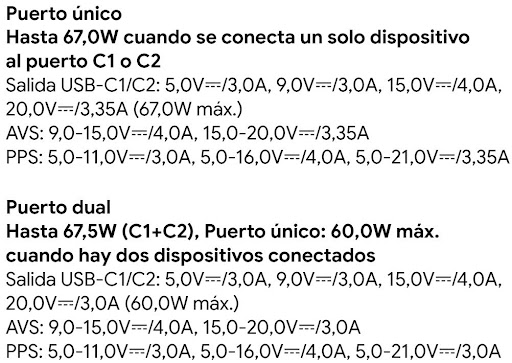 | Double port Jusqu'à 67,5 W (C1 + C2), port unique : 60 W max. lorsque deux appareils sont connectés Sortie USB-C1/C2 : 5 V⎓/3 A, 9 V⎓/3 A, 15 V⎓/4 A, 20 V⎓/3 A (60 W max.) AVS : 9-15, V⎓/4 A, 15-20 V⎓/3 A PPS : 5-11 V⎓/3 A, 5-16 V⎓/4 A, 5-21 V⎓/3 A |