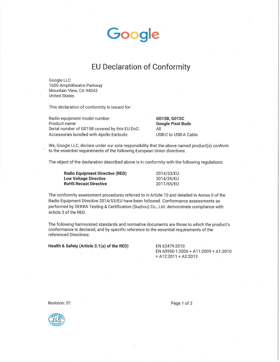 EU Declaration of Conformity (Pixel Buds Gen 1)