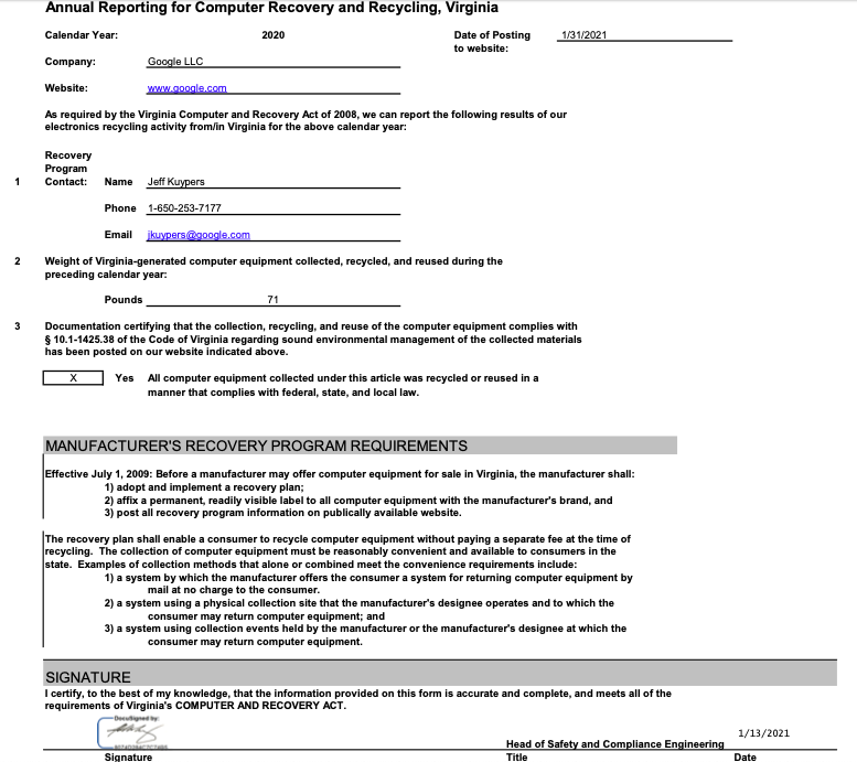 Google offers a US-wide mail-back program through its partner, Reverse Logistics Group Americas (RLGA), for Google's customers to return some Google-branded products for free recycling. To use the mail-back program, follow the steps below: