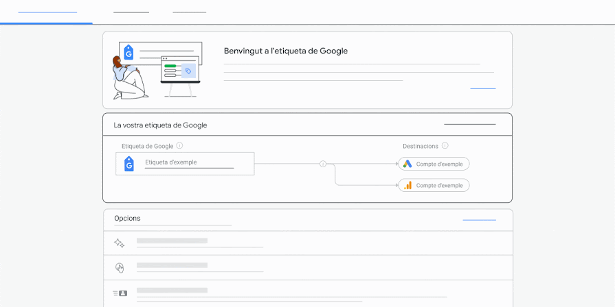 La pantalla "Etiqueta de Google" de Google Ads, Google Analytics i Campaign Manager 360 us permet accedir a les funcions de mesurament sense afegir codi després de la configuració inicial. Els canvis en la configuració de l'etiqueta de Google afectaran totes les destinacions associades.