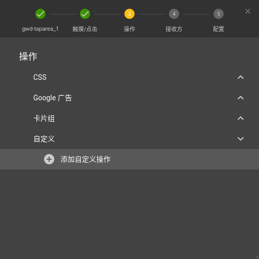 - 对于操作,请依次选择自定义 > 添加自定义操作。Google Web Designer 会提示您输入自定义代码。