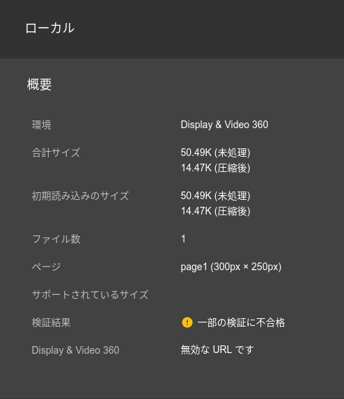 Google 広告と Google AdMob の広告サイズの上限は 600 KB です。この上限以下になるよう、広告の圧縮ファイルの合計サイズを縮小してください。 |