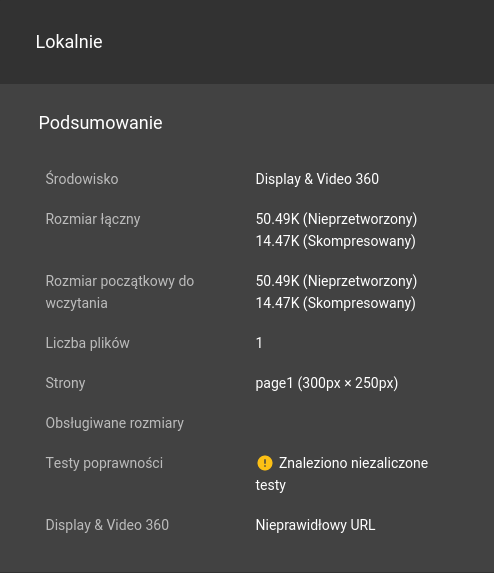 Weryfikator reklam sprawdza reklamę pod kątem częstych problemów i wyświetla wyniki w panelu razem z podstawowymi informacjami takimi jak środowisko reklamowe, całkowity rozmiar reklamy w przypadku jej opublikowania oraz początkowy wczytywany rozmiar. Panel jest aktualizowany automatycznie, gdy dokonasz zmiany, więc zawsze przedstawia aktualną wersję reklamy.