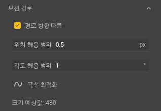 | 크기 예상값 | 모션 경로의 예상 크기를 표시합니다. 더 압축하려면 곡선 최적화 버튼을 사용합니다. |