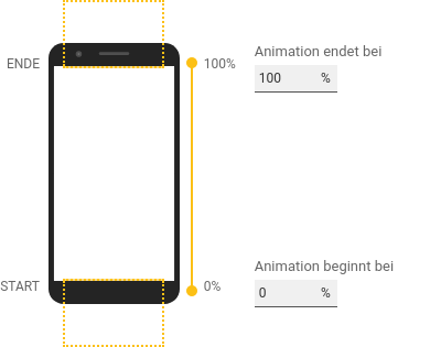 Das Timing der Animation für die Komponente "Parallaxe" hängt davon ab, wie weit sie bereits in die Seite oder aus der Seite gescrollt wurde. Standardmäßig beginnt die Animation, wenn der obere Rand der Komponente auf der Seite sichtbar wird (0 %), und sie endet, wenn der untere Rand oben auf der Seite verschwindet (100 %). Wenn Sie einen mittleren Zustand hinzugefügt haben, können Sie auch anpassen, wann er während der Animation auftritt. Es gibt zwei Möglichkeiten, das Timing der Animation anzupassen: