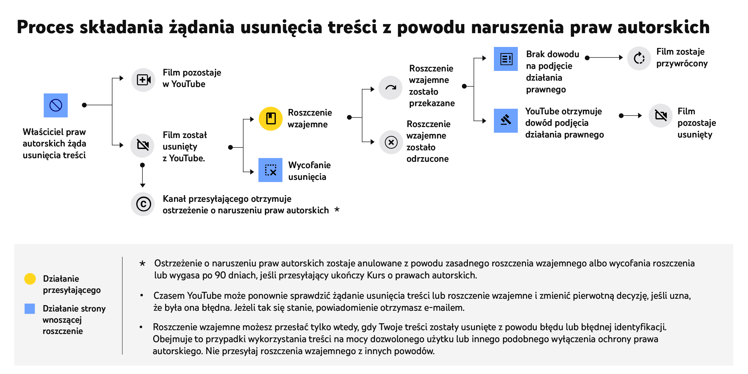 Roszczenia wzajemne są przekazywane osobie, która przesłała żądanie usunięcia. Ma ona 10 dni roboczych (według kalendarza obowiązującego w Stanach Zjednoczonych) na dostarczenie dowodów podjęcia działań prawnych. Treści pozostaną niedostępne na YouTube, jeśli działania prawne są w toku. W przeciwnym razie treści zostaną przywrócone, a ostrzeżenie o naruszeniu praw autorskich zostanie usunięte z kanału przesyłającego.