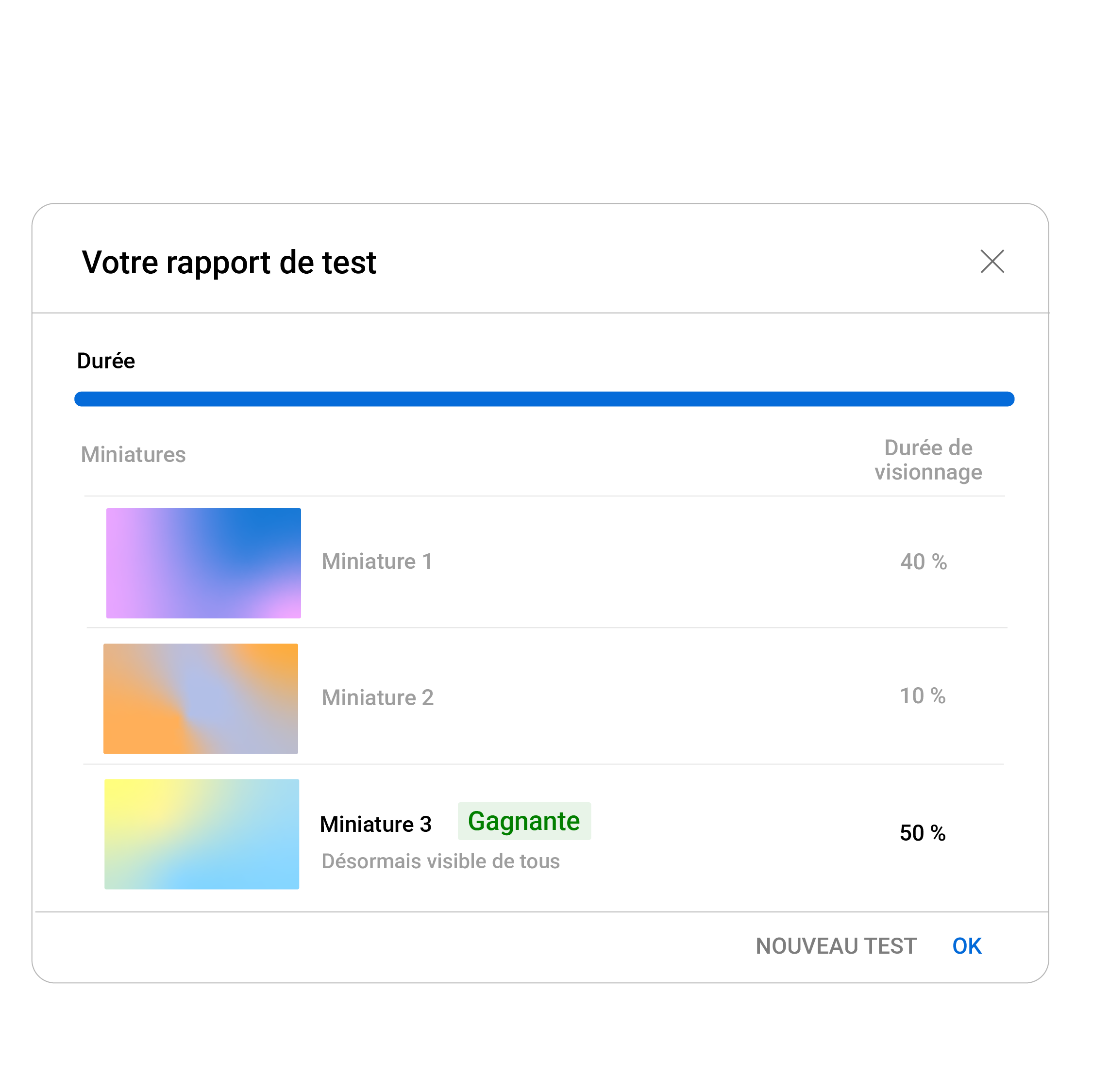 À l'issue du test, votre miniature affichera l'un des résultats suivants en fonction de la part de durée de visionnage :