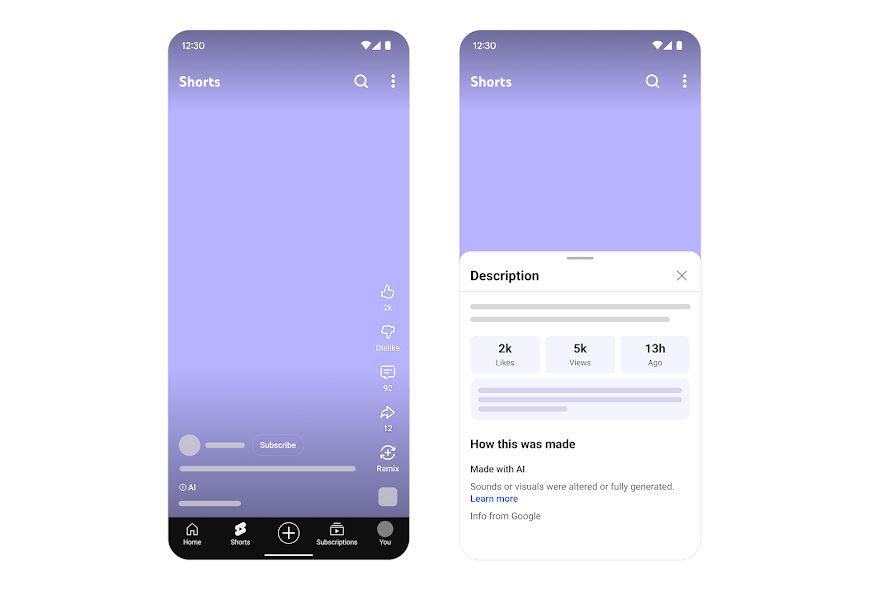 YouTube overfører erklæringer fra værktøjer og youtubere, hvor sikre Content Credentials-data (C2PA) i version 2.1 eller nyere er tilgængelige, som angiver, at hele videoen er lavet med AI. Dette kan omfatte en etiket på selve videoafspilleren eller sprog i den detaljerede beskrivelse.