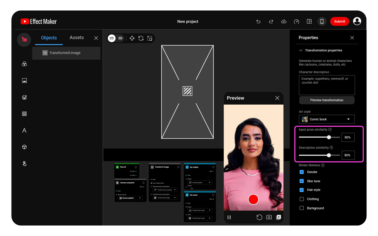 - 포즈 및 설명 유사성: 이미지 입력의 변환 강도를 조정합니다.