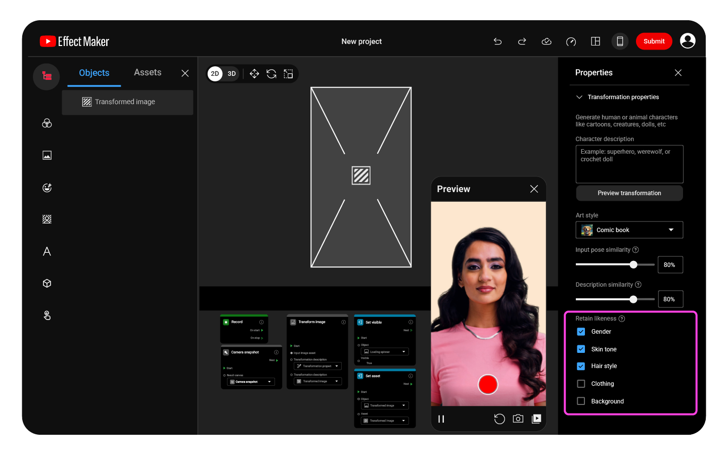 effects.youtube.com에서 효과 도구에 로그인하고 새 프로젝트를 시작합니다. 처음 사용하는 경우 효과 도구 시작하기에 대해 자세히 알아보세요.