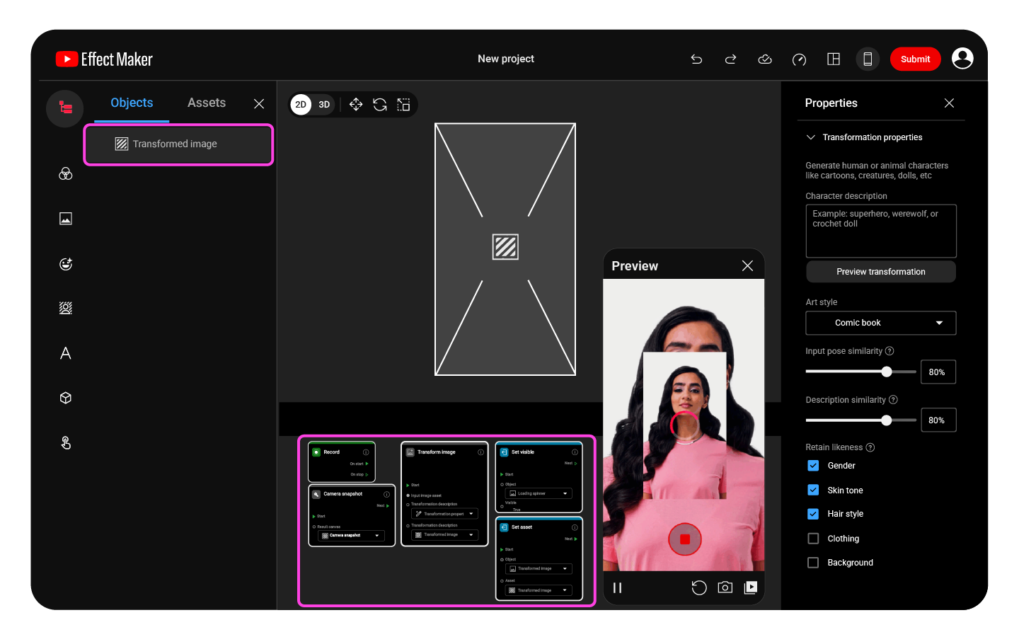 효과 도구의 생성형 AI 제작 도구를 사용하면 변환 효과를 만들 수 있습니다. 변환 효과는 참고 이미지나 그림을 가져와 AI 생성 출력을 만듭니다. 효과 도구를 사용하면 텍스트 설명이나 참조 그림만으로 다양한 변환 효과를 만들 수 있습니다.