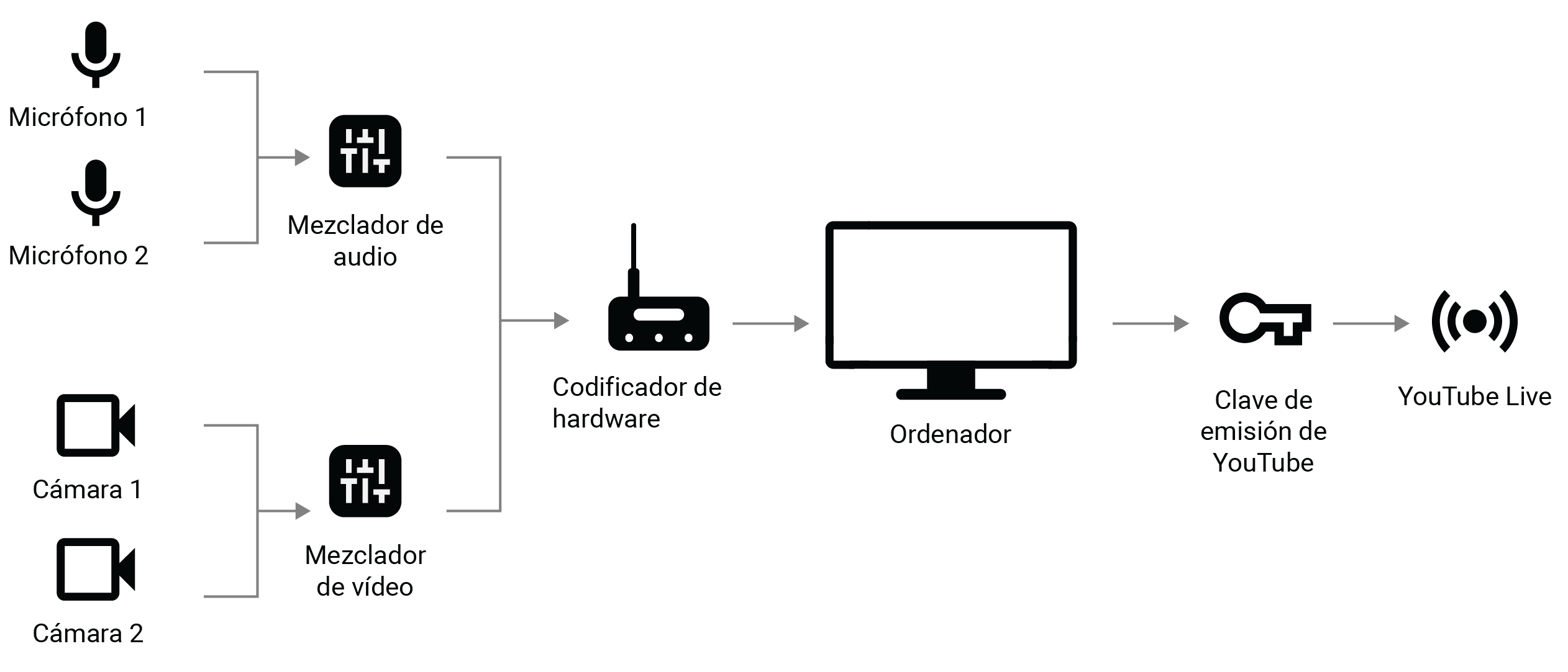 Hay tres formas de emitir en directo en YouTube: con una cámara web, con un dispositivo móvil o con un codificador (bien un software de streaming o un codificador de hardware). Si utilizas un codificador, puedes hacer lo siguiente: